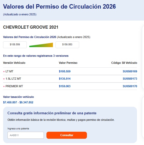 Como habrás notado puedes ver el valor del permiso de circulación para cada versión del Chevrolet Groove, en este caso. Además, abajo puedes ver el rango que existe entre el valor de la tasación para cada versión del exitoso SUV compacto de la marca norteamericana.